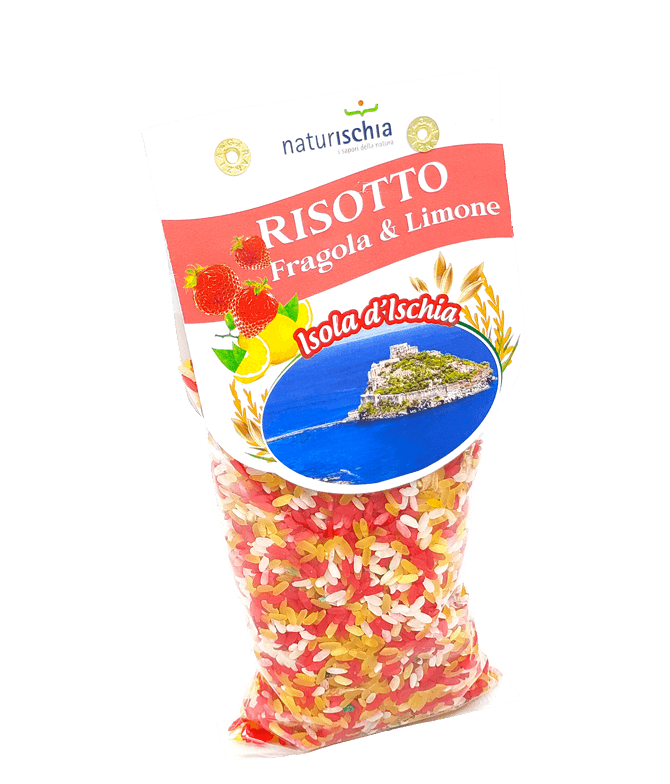 INGREDIENTI: Riso precotto (trattato con salsa con salsa di limone, salsa di fragola), limone essiccato 2%, fragola 2%, pomodoro, curcuma, bietola rossa, prezzemolo, cipolla, spezie.