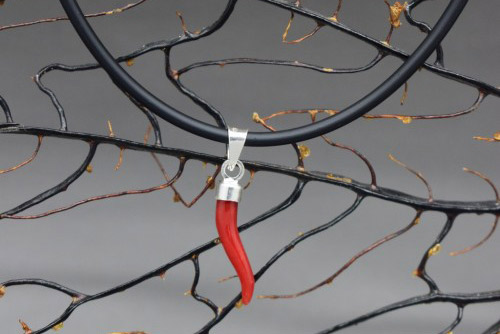 Cornetto di corallo rosso con cappuccio in argento e collana di caucciù nero, lunga cm 45 con chiusura in argento 925 rodiato.