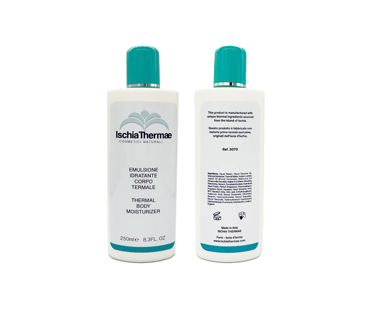 Straordinaria crema multiattiva per il corpo, adatta a tutti i tipi di pelle. La sua formulazione a base di Acqua Termale Ischia Thermae, procurando un’intensa idratazione, aiuta a migliorare il processo di rinnovamento cutaneo. Agisce riducendo notevol-mente la secchezza e le ruvidità della pelle. Un fattore naturale di protezione UV e sostanze idrofile e filmogene  assicurano sia un’effi-cace prevenzione dalle aggressioni ambientali e solari, che  un’ azione contrastante dei primi segni dell’invecchiamento cuta-neo. La struttura della pelle in superficie assume un aspetto estremamente più levigato, più teso, molto più morbido. La pelle ritrova in breve tempo una gio-vanile radiosità.